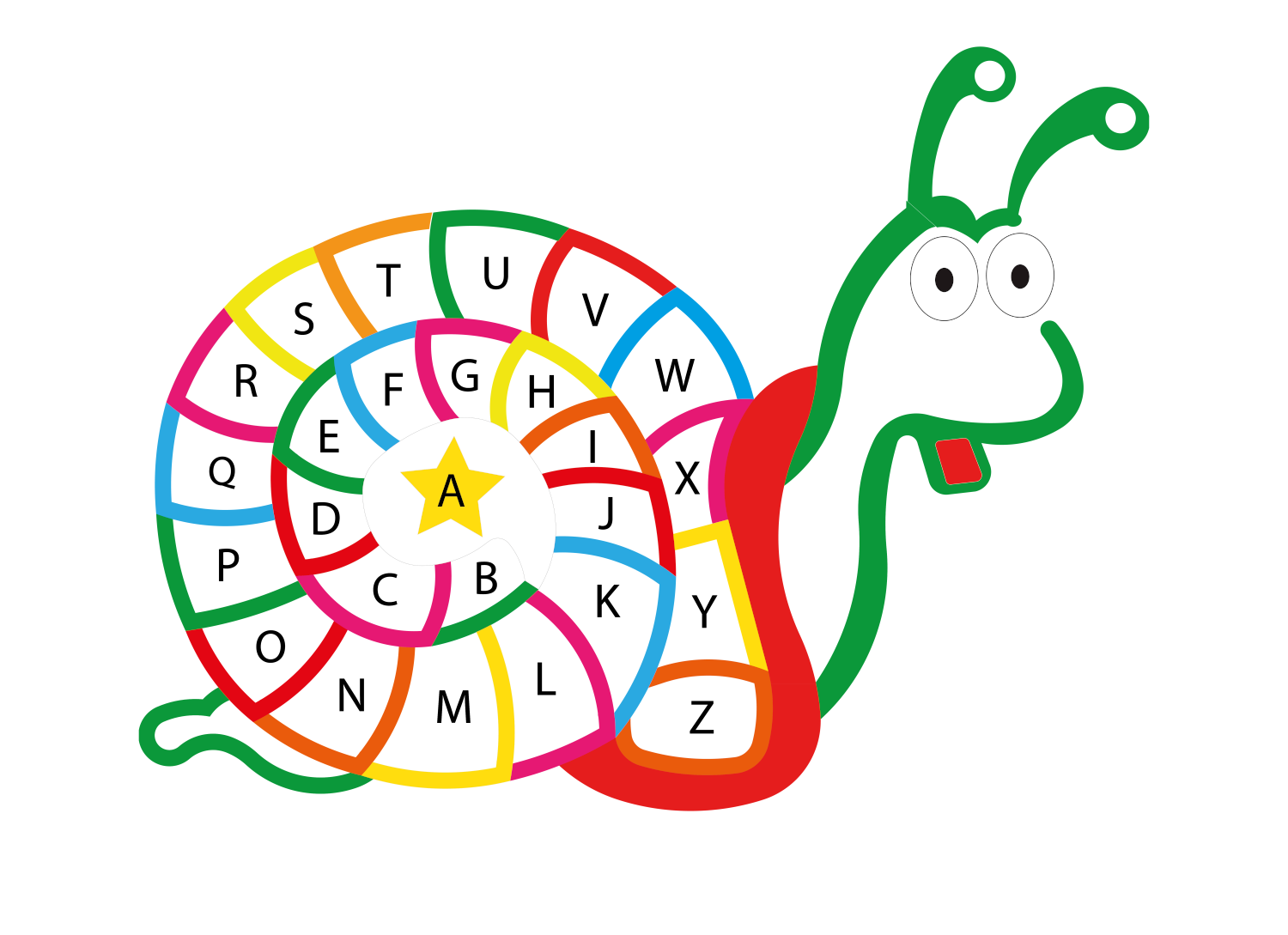 Avec ses 3,20 m x 2,40 m, cet escargot pédagogique transforme l’apprentissage des lettres en une aventure colorée et dynamique. Sa carapace, dessinée en spirale, est composée de carrés colorés dans lesquels apparaissent les lettres de l’alphabet en majuscule, de A à Z.