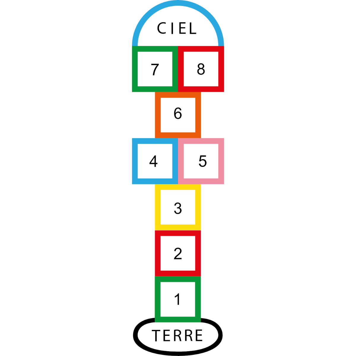 Cette marelle de 3,10 m x 0,80 m reprend la forme classique du jeu d’enfant, avec une touche graphique contemporaine : chaque chiffre est encadré dans un carré aux contours colorés, offrant une lisibilité et une attractivité visuelle renforcées.